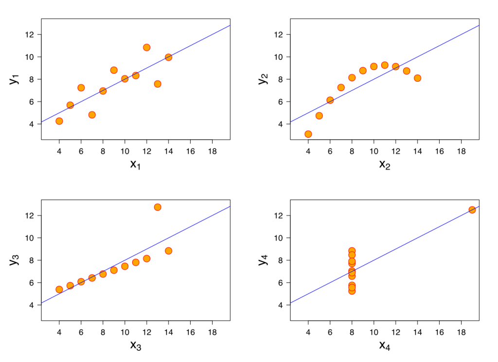 إلى أن جاء عالم انجليزى اسمه فرانسيس أنسكومب عام 1973 وقلب هذا الاعتقاد رأسا على عقب عن طريق تقديم 4 مجموعات من البيانات من القيم x, y متطابقة من حيث الملخصات الرقمية:
